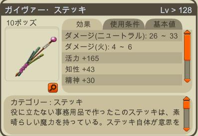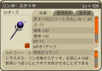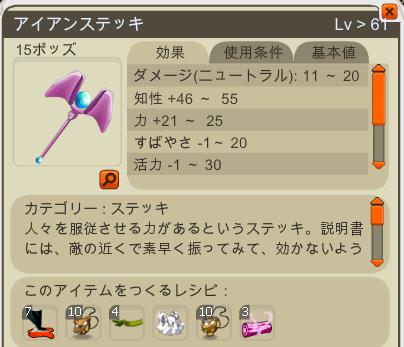 魔術レベリング用の武器は4段階分ちゃんと準備していたんだけれど、Lv40くらいで止まっていた。用意していたステッキじゃどうも効率がイマイチだったので、2日くらい前?にアイアンステッキを師匠に作ってもらったv ついでに他にも2種。サブ用のガイヴァーステッキ。 メインの保険用リンボステッキ。