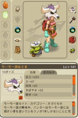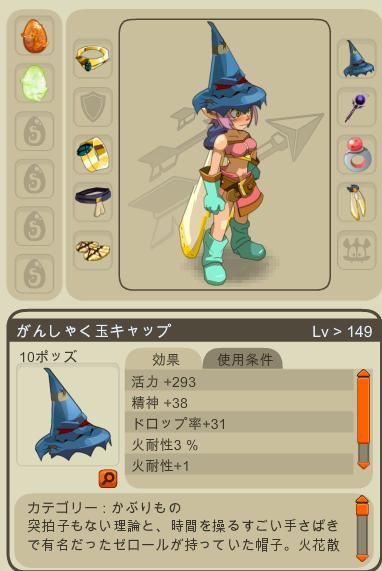 ルーシャ(13158):その辺のモンスをボコってガラクタを集める係なので、なるべく物を持たせたくない&お気に入りの帽子だけは持っておきたい。知性&運&精神クラ190台 5職100